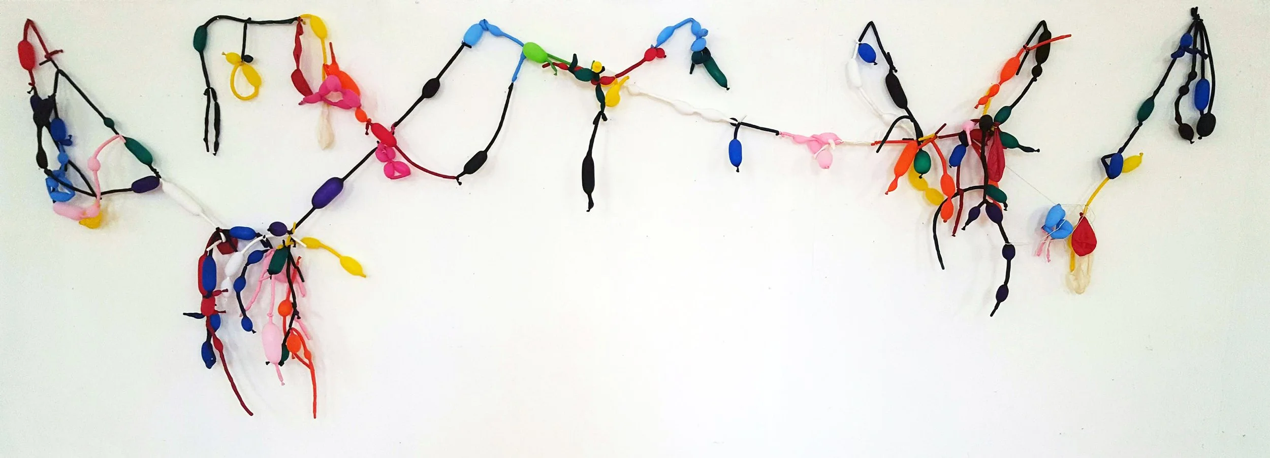 What remains after the collapse are deflated fragments, pinned to the wall like relics of a ritual - bright, visceral, and strangely organic, resembling entrails more than party leftovers. This transformation pushes the playful toward something slightly more unsettling, where innocence carries a trace of fleeting childhood and onwards to the inevitable.