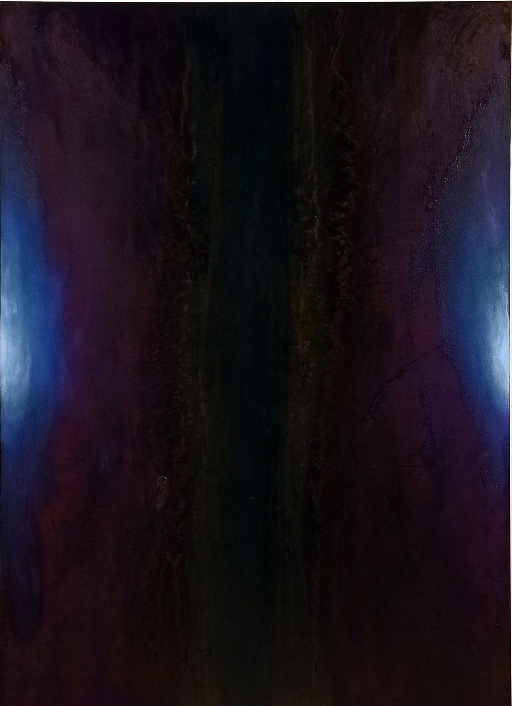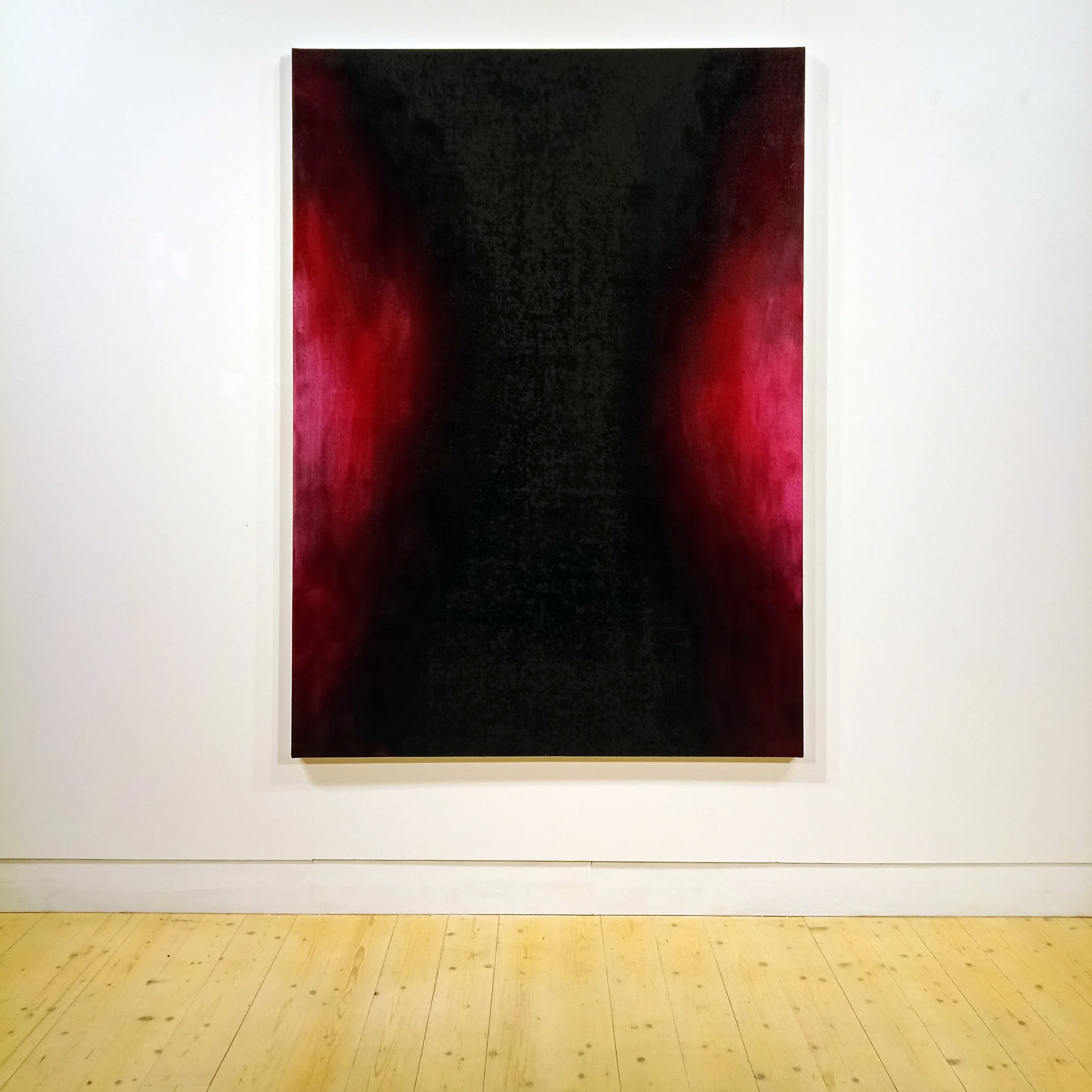 Central to each painting is a recurring formal device: a nearly compact black vertical horizon that bisect the canvas. This stark boundary serves both as a symbolic divide and a metaphysical mirror - a point of no return, and simultaneously, a possible portal. It embodies the oppressive weight of loss, but also the necessity of darkness as threshold. Like a wound or an opening, this horizon both breaks and holds the composition together.